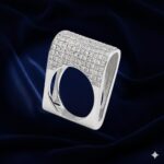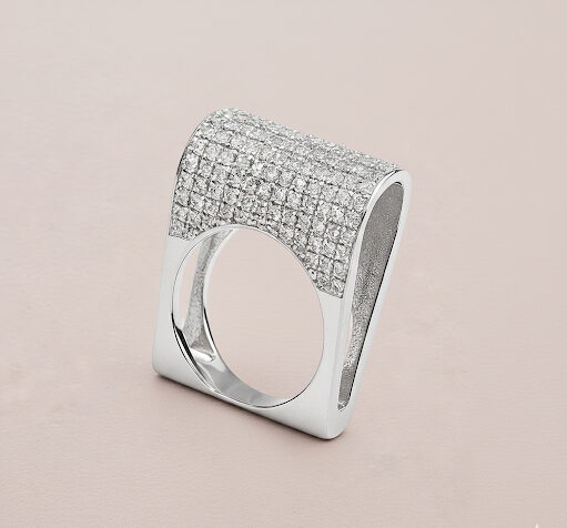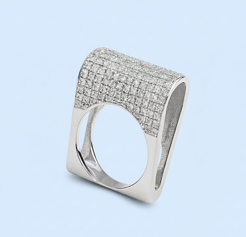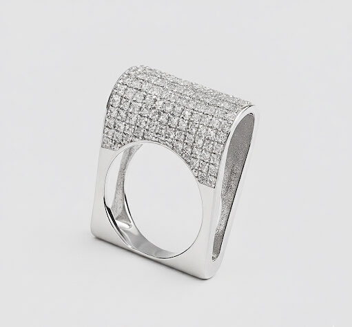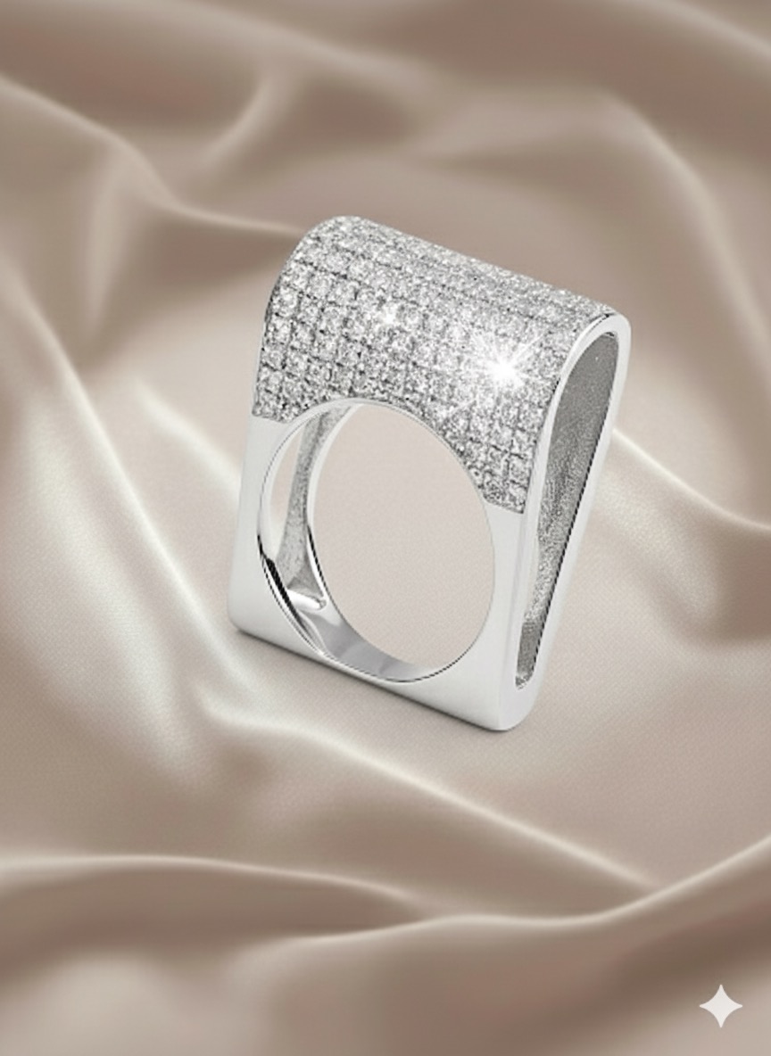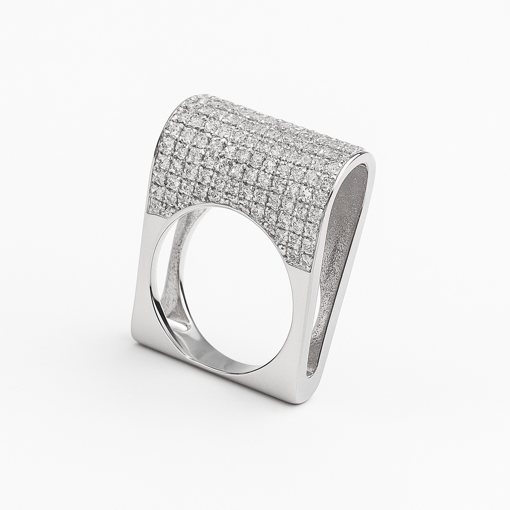 A bold square-shaped silver ring, fully encrusted with sparkling white stones.