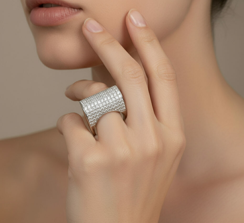 A bold sterling silver 925 pavé ring featuring hand-set 5A quality Signity stones for a dazzling, high-shine finish. Perfect for statement wear, parties, and gifting. Durable craftsmanship with a modern square-edge design.