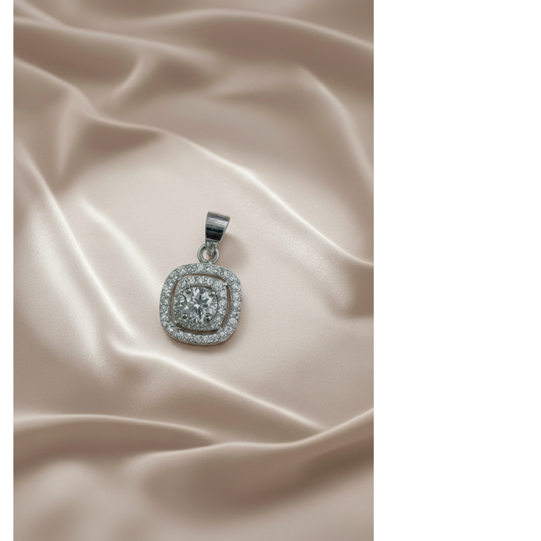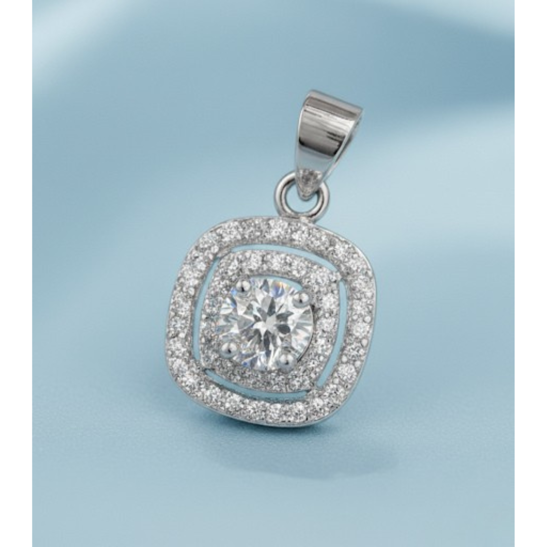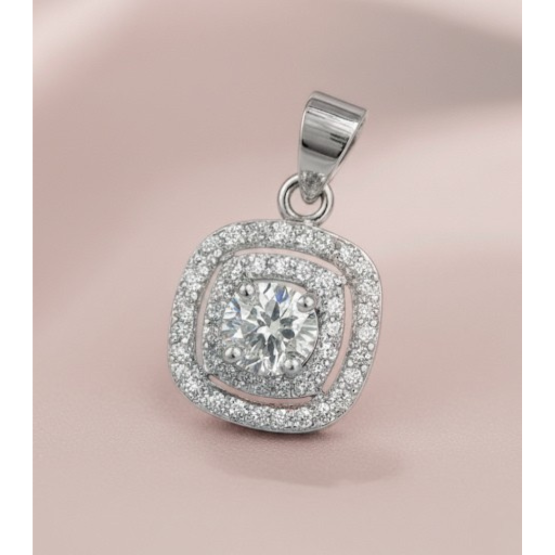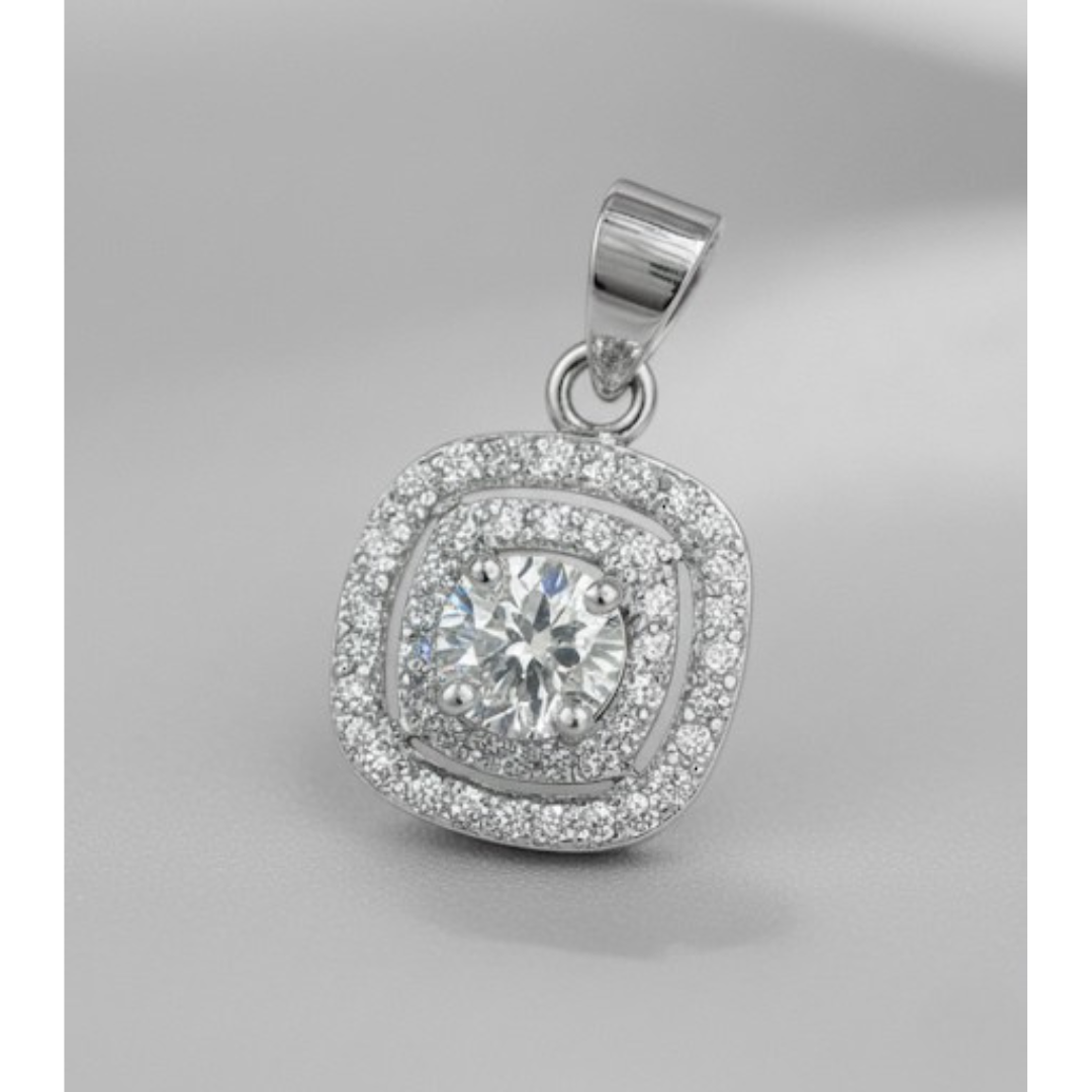 Glamorous square halo pendant in 925 silver with 5A quality Signity Stone sparkle.