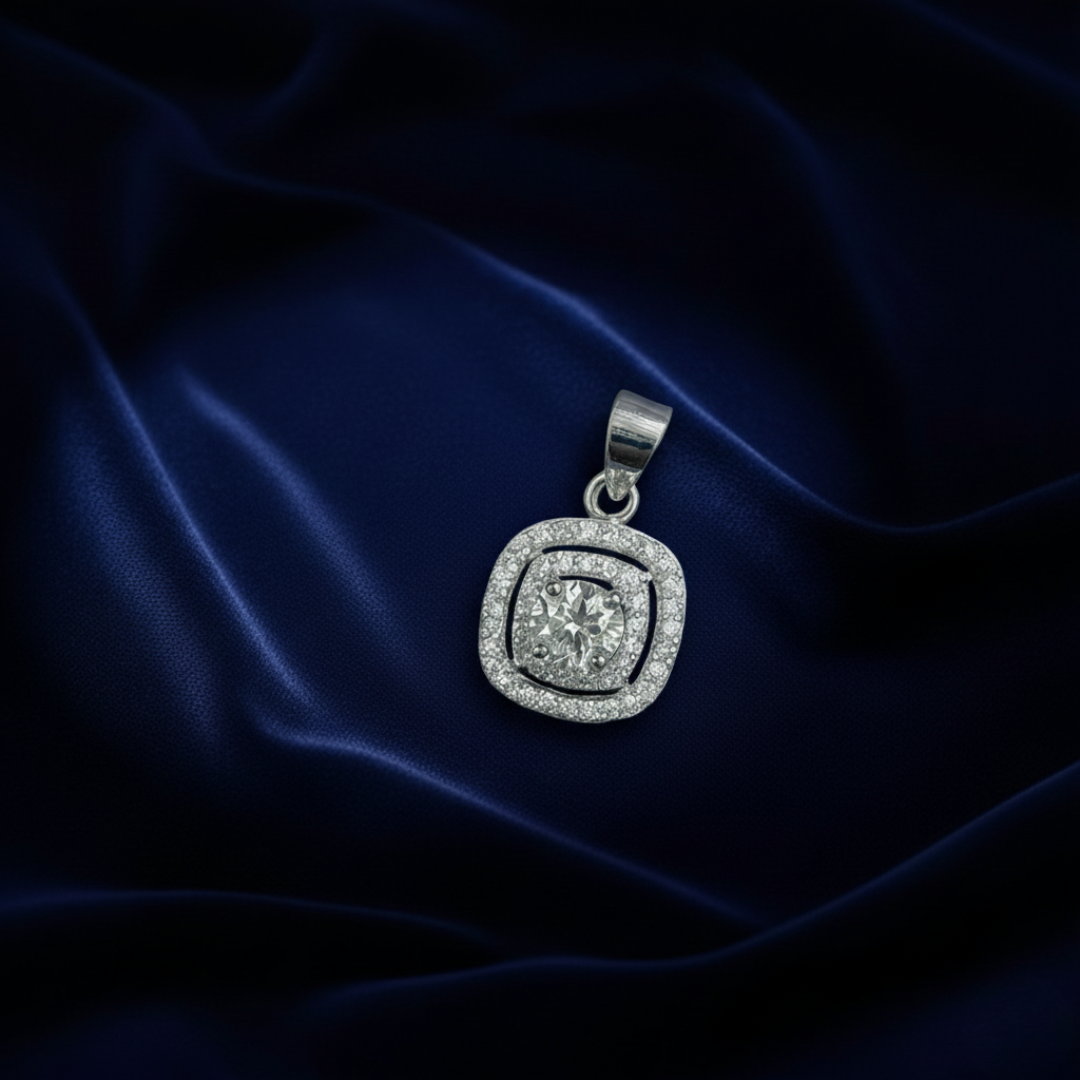 Sterling Silver 925 square halo pendant with 5A quality Signity stones. A bold yet elegant design for party wear and special occasions.